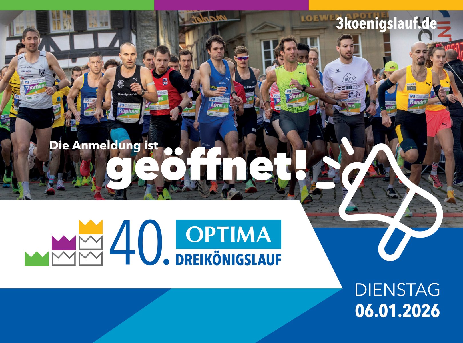 Die Anmeldung für den 40- OPTIMA Dreikönigslauf in Schwäbisch Hall am 06.01.2026 ist ab heute geöffnet. Bis zu 850 Kinder, 350 Jugendliche und 2.700 Erwachsene haben die Möglichkeit, aktiv an der größten Sportveranstaltung im Landkreis Schwäbisch Hall teilzunehmen, bei der Sportbegeisterte jeden Alters auf ihre Kosten kommen.